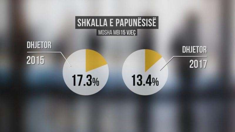 Ky është i teti tremujor radhazi që papunësia shënon rënie në Shqipëri, duke zbritur nga 17.3 për qind që ishte në fund të 2015-ës, në 13.4 në dhjetor të 2017.