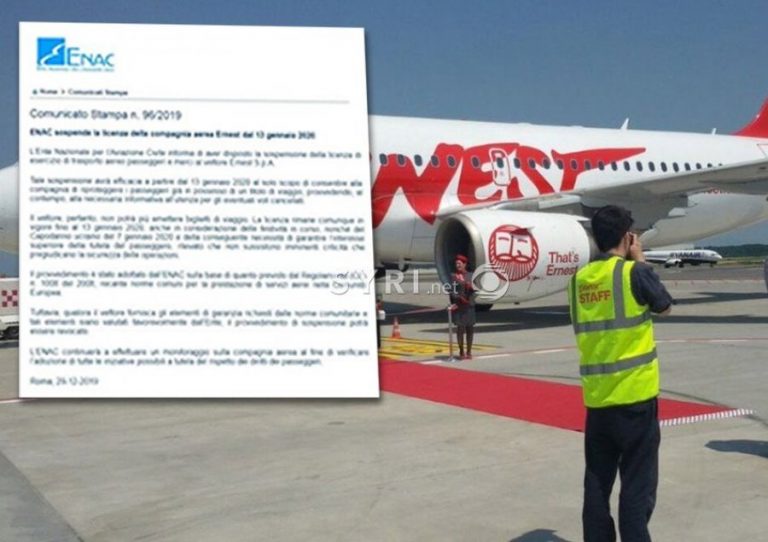 “Nëpërmjet deklaratës për shtyp n. 96/2019 të Autoritetit Italian të Aviacionit Civil (ENAC), njoftohemi se ENAC ka nxjerrë aktin e pezullimit të licencës së kompanisë ajrore “Ernest”. Pezullimi do të hyj në fuqi më 13 Janar 2020, me qëllim e vetëm që t’i jap kohë kompanisë për të informuar pasagjerët për anullimin e fluturimeve apo për t’i mbrojtur ata që e kanë prerë një biletë udhëtimi.