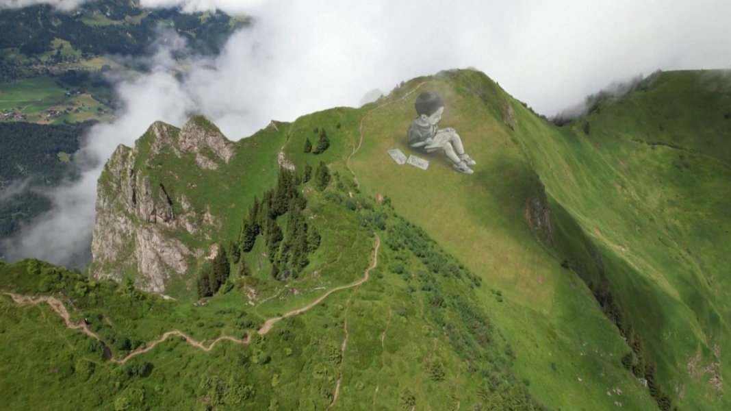 Në shpatet  e malit në një fshat të Zvicrës artisti Saype ka realizuar këto piktura  gjigande. Pikturat të cilat  janë realizuar në shpatet e malevemund të zgjasin disa ditë në varësi të kushteve të motit.Vajza dhe libri”, piktura gjigande e realizuar me miell e vaj në majën e  malit (FOTO) – AlpeNews