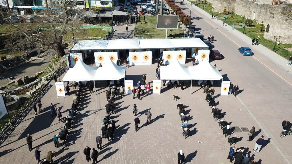 Vaksinimi i të moshuarve mbi 70 vjeç vijon edhe në Elbasan. Në qendër të qytetit, pranë kalasë janë vendosur tenda dhe platforma të posaçme për shpërndarjen e vaksinës kineze Coronavac tek të moshuarit që janë vendosur në rreshta dhe presin për t’u vaksinuar.