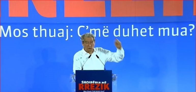 “Shqipëria është në rrezik. Ishte kushtrimi që u ngriti juve në këmbë për ta shpëtuar atë. Vëllezër e motra ju jeni sot këtu, sepse ju nuk pranoni që qytetarët shqiptarë të jenë qytetarë të lirive dhe të drejtave të dhunuara. 32 vite më parë kur krijuam partinë e parë opozitare, diktatori i fundit dhe partia-shtet kishin në duar të gjitha pushtetet. Sot, pasardhësi i tyre, Edi Rama, ia mbathi. Edhe pse ka të gjitha pushtetet, ka vendosur monizmin e plotë përsëri. Ia mbathi, përsëri do ia mbath. Orët e tij janë të numëruara. Në emrin tuaj i them Edi Ramës këto fjalë: Edi Rama ne të dy sot jemi armiq, jemi armiq. Po pse jemi? Zemra ime fjalë tjetër nuk nxjerr, sepse ti Edi Rama ke për ideal pushtetin, pushtetin dhe vetëm pushtetin, kurse me këta burra e gra, djem e vajza, kemi për ideal lirinë, lirinë dhe vetëm lirinë”, tha Berisha.