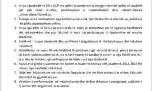 Studentët kërkojnë gjithashtu ndërtimin e bibliotekave me standarde europiane dhe me libër universitar online, falas për studentët në gjuhën shqipe. Në fund, studentët kërkojnë gjithashtu vlerësimin e performancës në mësimdhënie dhe kërkim shkencor të pedagogëve, publikimi i tij online dhe regjistrimi i leksioneve.