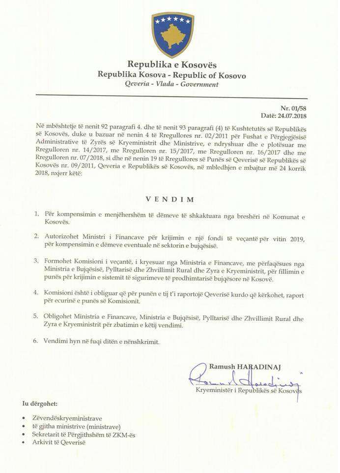 “Krahas kësaj, sot kam autorizuar Ministrinë e Financave për krijimin e një fondi të veçantë për vitin 2019 dhe themelimi i Komisionit që do të krijojë sistemin e sigurimeve të prodhimtarisë bujqësore në Kosovë është një tjetër hap i rëndësishëm për ta stabilizuar tregun e bujqësisë në vend dhe për t’i dhënë përkrahje kësaj fushe”, ka shkruar Haradinaj në llogarinë e tij në Facebook.