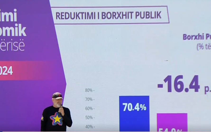 Ne nuk kemi një program dëshirash, as manifest ëndrash që partitë e tjera përpiqen t’i shesin në tregun e fushatës. Këto janë projeksione nga ekspertë sepse ne kemi një program qeverisës deri në 2030. Shqipërinë e morrëm me një borxh 70%, më i larti në rajon, por që nuk ishte kaq në të vërtetë, por kishte edhe një borxh të fshehur që nuk ishin paguar kompanitë e rrugëve, e investimeve të tjera, e të shërbimeve. Sot nuk i kemi borxh asnjë kompanie, ndërkohë që borxhin publik e kemi ulur në një normale prej 54% dhe projeksioni në Shqipërinë 2030, do ta çojmë në 50 %, me një minus të lehtë nën 50 %.