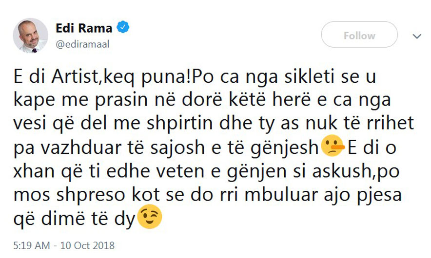 Në një postim në Twitter, Rama u shpreh: “E di Artist, keq puna! Po ca nga sikleti se u kape me prasin në dorë këtë herë e ca nga vesi që del me shpirtin dhe ty as nuk të rrihet pa vazhduar të sajosh e të gënjesh. E di o xhan që ti edhe veten e gënjen si askush, po mos shpreso kot se do rri mbuluar ajo pjesa që dimë të dy”./Top Channel/