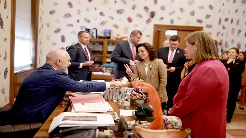 “Kryeministria – Me senatorë e kongresmenë nga Shtetet e Bashkuara, në një rrugë miqësie e partneriteti që forcohet dita-ditës”, shkruan Rama, ndërsa shihet se iu ka dhënë edhe disa dhurata të ftuarve të tij!