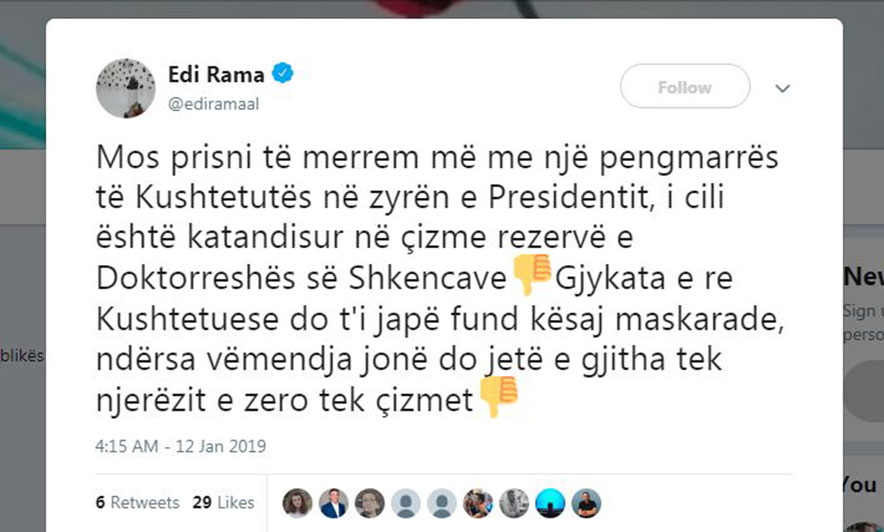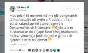“Mos prisni të merrem më me një pengmarrës të Kushtetutës në zyrën e Presidentit, i cili është katandisur në çizme rezervë e Doktorreshës së Shkencave”, shkruan Rama.