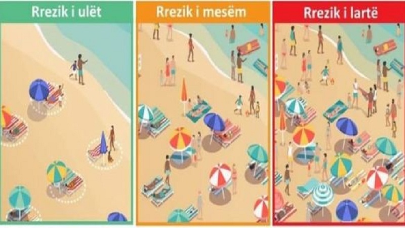 Përmes shembujve të publikuar, Ministria e Shëndetësisë informon se frekuentimi i plazheve më pak të populluara dhe ku shezlongët janë të vendosur në distancë nga njëri-tjetri, përbën një rrezik të ulët për t’u prekur nga virusi, në krahasim me plazhet e mbi populluara e ku çadrat janë të vendosura shumë pranë njëra-tjetrës, si një rrezik i madh për t’u infektuar me COVID dhe për ta përhapur si sëmundje.