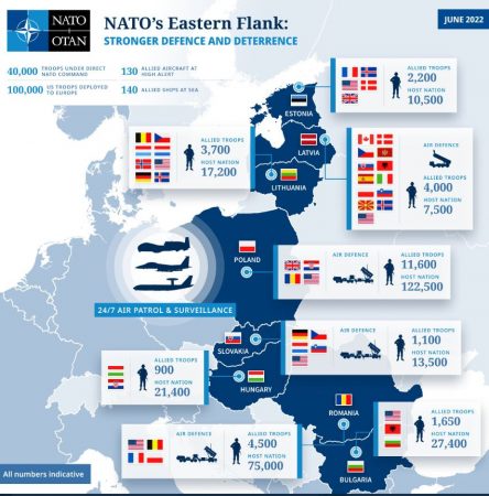Zëdhënësja e NATO-s, Oana Lungescu ka publikuar në llogarinë e saj në Twitter edhe një postim grafik ku shkruan se në përgjigje të pushtimit rus në Ukrainë, NATO ka përforcuar prezencën e saj mbrojtëse në pjesën lindore të Aleancës më shumë trupa, avionë dhe anije luftarake.