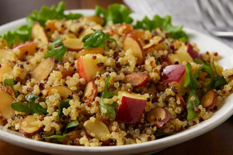 Kinoa, mollë, mjaltë, bajame e qepë të njoma, të gjitha në një pjatë të madhe që pret për t’u shijuar.