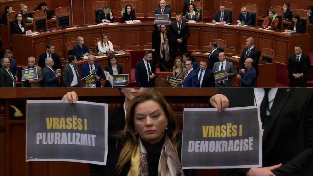 Edhe pse nuk pati flakadanë, karrige grumbull e përplasje verbale, këtë herë deputetët e opozitës qëndruan në këmbë para foltores me pankarta në duar.
