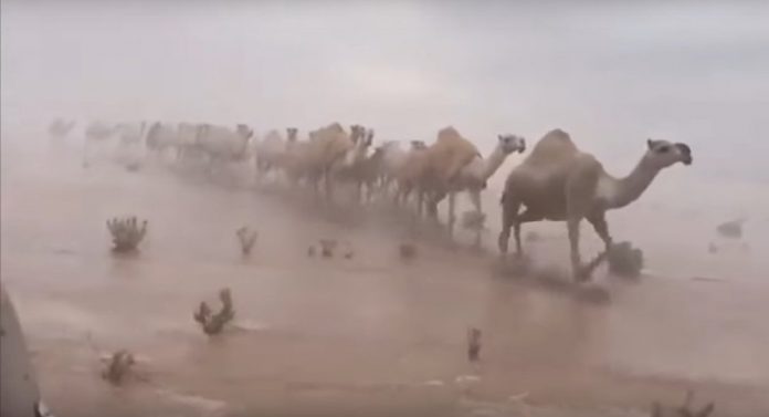 Përdoruesit e mediave sociale kanë postuar video të shkretëtirës së përmbytur, duke treguar njerëzit që luftojnë kundër forcave të natyrës.