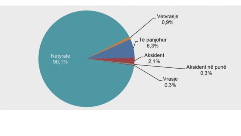 Sipas një raporti të publikuar nga Instituti i Statistikave mbi shkaqet e vdekjeve në Shqipëri, 90.1% e shqiptarëve vdesin për shkaqe natyrale, pra sëmundje të ndryshme, 0.9% kryejnë vetëvrasje dhe 2.1% vdesin në aksidente.