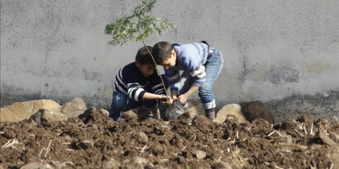 Fëmijët e qarqeve të qytetit Humus në Siri, të cilat ndodhen nën rrethimin e regjimit të Bashar al Asadit, po mbjellin fidanë në vend të pemëve të cilat janë djegur për ngrohje.