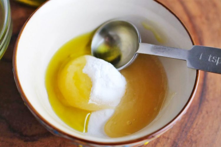 Mjafton të hidhni në një tas të vogël një lugë çaji me sodë buke dhe dy lugë çaji me vaj ulliri.