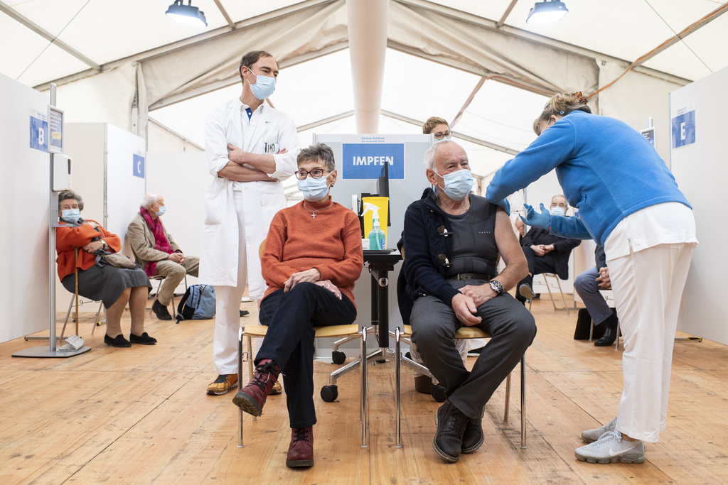 Qytetarët e parë të Kantonit të Cyrihut, burrë e grua Stuessi nga Wetzikon-i, janë vaksinuar sot kundër koronavirusit Covid-19, në qendrën e vaksinimit të referencës EBPI në Hirschengraben në Cyrih.