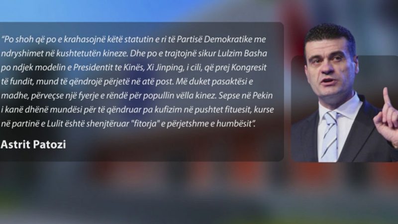 “Po shoh që po e krahasojnë këtë statutin e ri të Partisë Demokratike me ndryshimet në Kushtetutën kineze dhe po e trajtojnë sikur Lulzim Basha po ndjek modelin e Presidentit te Kinës, Xi Jinping, i cili, që prej Kongresit të fundit, mund të qëndrojë përjetë në atë post. Më duket pasaktësi e madhe, përveçse një fyerje e rëndë për popullin vëlla kinez. Sepse në Pekin i kanë dhënë mundësi për të qëndruar pa kufizim në pushtet fituesit, kurse në partinë e Lulit është shenjtëruar “fitorja e përjetshme e humbësit”, shkruan ai në rrjetet sociale.