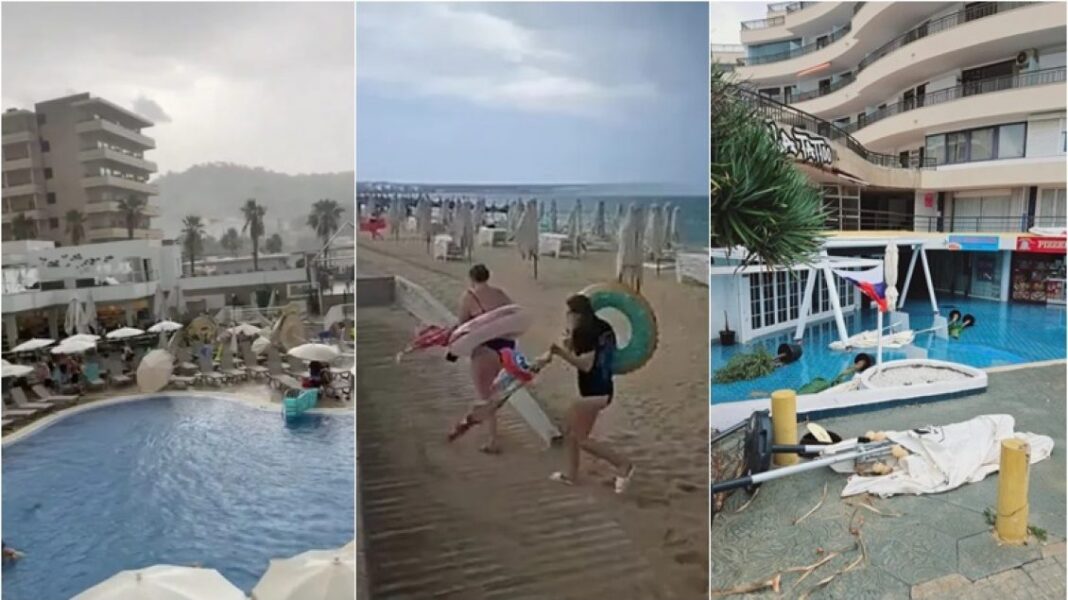Familjet u përpoqën për t’u strehuar ndërsa shezllonet dhe çadrat për diell u shpërndanë nëpër plazhe pasi stuhia goditi rreth orës 11 të mëngjesit.