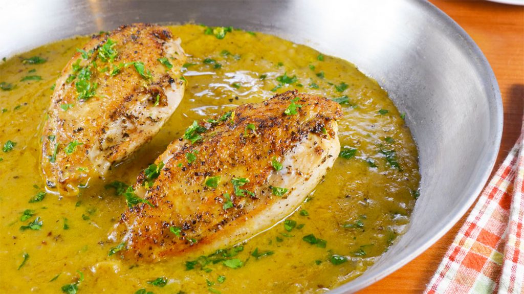 Ngadalë shtoni në tigan lëngun e mishit të pulës dhe më pas lëngun e limonit.