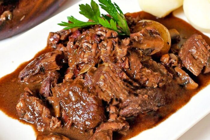 Ndërkohë 10 minuta para se gjella të jetë gati, pra kur lëngu të jetë trashur dhe mishi të jetë zbutur futeni në furrë të parangrohur në 250 gradë dhe lëreni përreth 10 minuta.