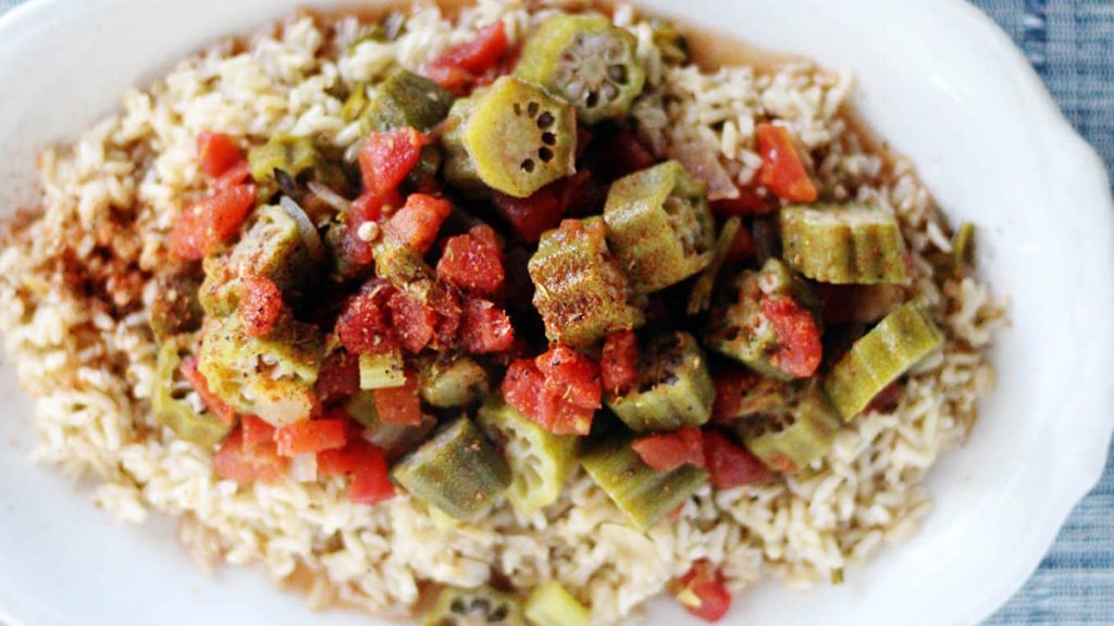 Hidhni me kujdes tek tava lëngun e mishit, orizin, domatet e prera në copa të vogla, majdanozin e grirë dhe bamjet e prera në radhë.