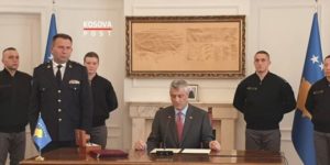 “Edhe njëherë dëshiroj që si president dhe komandant suprem të uroj të gjithë ushtarët, oficerët, nënoficerët, mbështetësit ndërkombëtarë, në këtë ditë të rëndësishme definitivisht të zyrtarizimit të Ushtrisë së Kosovës me nënshkrimin apo dekretimin e ligjit për Ministrinë e Mbrojtjes, ky dekret hyn në fuqi në datën e nënshkrimit. Urime Ushtria e Kosovës”, u shpreh Thçi /Kosova Post/
