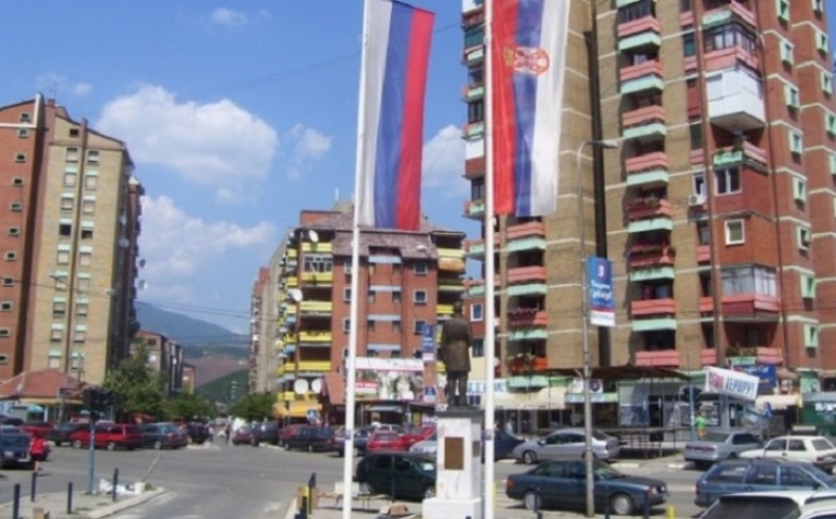Flamuj të Serbisë në Mitrovicën e Veriut, që ishin vendosur gjatë një tubimi të presidentit serb Aleksandar Vuçiq në këtë qytet.