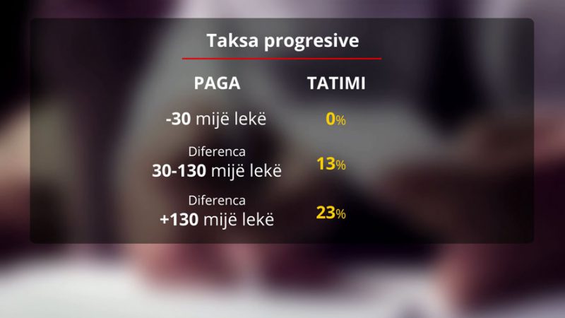 Ky është viti i katërt që qytetarët shqiptarë i janë nënshtruar tatimit progresiv mbi pagat, i vendosur nga qeveria Rama. Nga një taksë e sheshtë prej 10% për të gjitha kategoritë, po zbatohet një nivel taksimi me disa shkallë. Pagat deri 30 mijë lekë dhe gjithë pagat e tjera deri në këtë shumë nuk tatohen. 13% është taksa për diferencën nga 30 mijë deri në 130 mijë lekë. Mbi këtë shifër, pagat tatohen me 23%. Ndryshimi në paketën fiskale rrit pikërisht kufirin që tatohet me 13%.