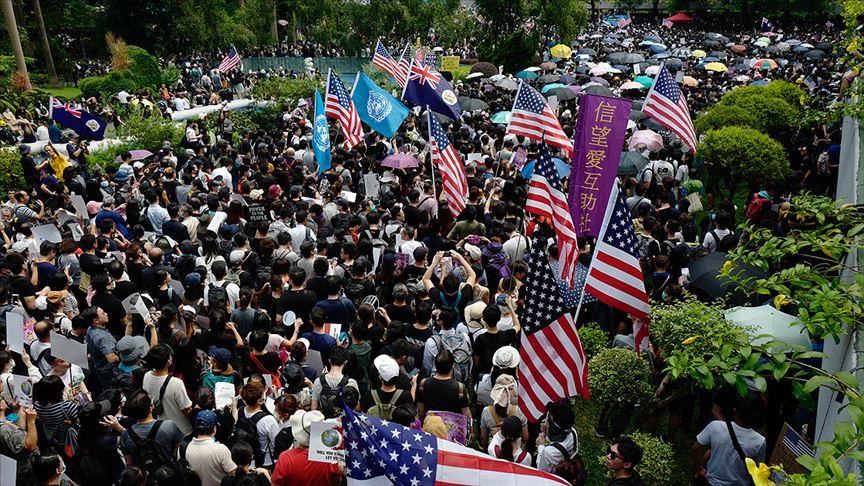Protestues të maskuar valëvitnin flamujt amerikan dhe mbanin pankarta me mesazhin “Çlirone Hong Kongun” të cilën ia drejtuan presidentit të SHBA-së Donald Trump.
