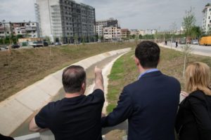 Më pas, kandidati për kryetar bashkie inspektoi punimet që po bëhen në një nga projektet më transformuese të Tiranës, që prek direkt edhe Njësinë 3 dhe që ka të bëjë me rehabilitimin e gjithë bregut të Lumit të Lanës, nga zona e Maternitetit të Ri deri te Ura e Shkozës. Ai vlerësoi punën e bërë në transfomimin e një zone që pak vite më parë ishte e mbuluar nga ferrat dhe papastërtitë, në një hapësirë që përveç sistemimit të lumit të Lanës, janë krijuar edhe trotuaret, zonat e gjelbra, rruga për makinat, si një zgjatim i pjesës tjetër të lumit të Lanës.