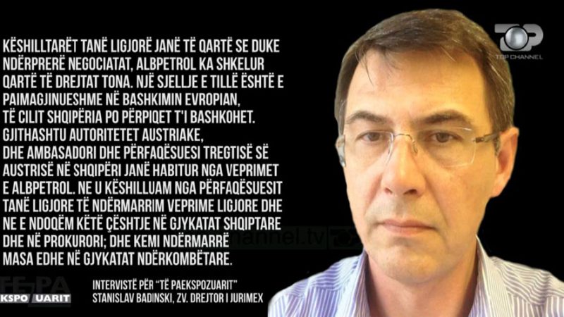 Në një intervistë ekskluzive për emisionin “Të Paekspozuarit” në Top Channel, zv. Drejtori i Jurimex, Stanislav Badinski, kompania austriake të cilës iu hoq koncesioni vitin e kaluar për 3 vendburimet e naftës Cakran, Gorisht dhe Amonicë, deklaron se do të hedh Shqipërinë në Gjykatën e Arbitrazhit, pasi kompania e tij është eliminuar padrejtësisht.