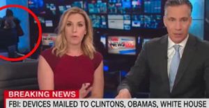 Prezantuesit e CNN, Poppy Harlow dhe Jim Sciutto ishin në transmetim live duke komentuar situatën dhe duke folur për pakot e dërguar Obamës dhe Clintons-it, kur alarmi i zjarrit ra në ndërtesën e tyre.