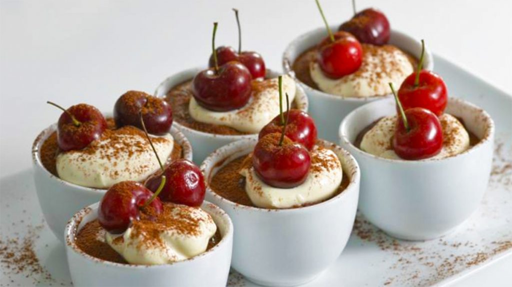Më pas hedhim pjesën tjetër të kremit duke mbushur gjysmën e kupave. Në fund shtojmë sërish një shtresë me biskota të thërmuara, arra dhe nga një lugë të vogël me reçel qershie.