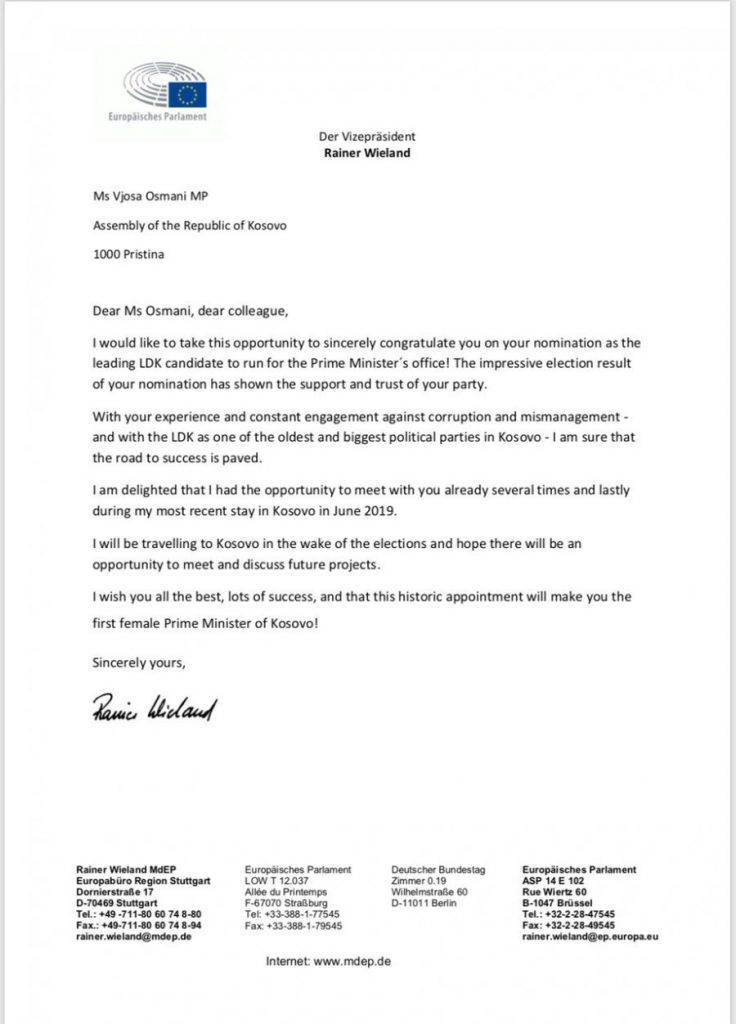 Zëvendës Presidenti i Parlamentit Evropian Rainer Wieland, siç njofton Lidhja Demokratike e Kosovës, ka uruar Vjosa Osmanin për nominimin madhështor që do ta bëj Vjosën ‘Kryeministren e parë grua në Kosovë’.